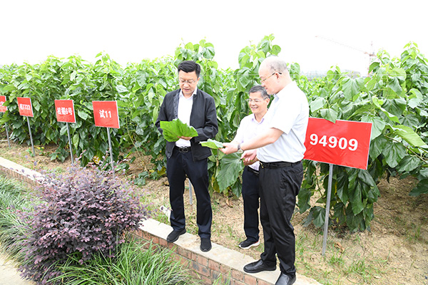 韋波一行在廣西蠶業(yè)技術(shù)推廣站站長李標(biāo)的陪同下,先后參觀了人工飼料養(yǎng)蠶基地、桑樹資源圃、桑蠶母種種性保持與繁育中心、桑黃栽培車間、蠶種質(zhì)量檢驗(yàn)室及冷庫、蠶桑遺傳改良與技術(shù)創(chuàng)新中心實(shí)驗(yàn)室和科研成果展示館,聽取了關(guān)于蠶、桑種質(zhì)資源保持、新品種培育、基礎(chǔ)研究進(jìn)展及單位布局規(guī)劃等方面的情況匯報(bào)。