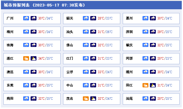 17日,韶關、清遠、河源和珠江三角的中北部市縣陰天到多云有中到大雨局部暴雨,其余市縣多云間陰天,有分散(雷)陣雨局部大雨。最高氣溫:粵西、珠三角西部市縣31℃~34℃,其余市縣26℃~30℃。