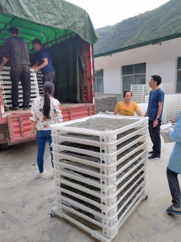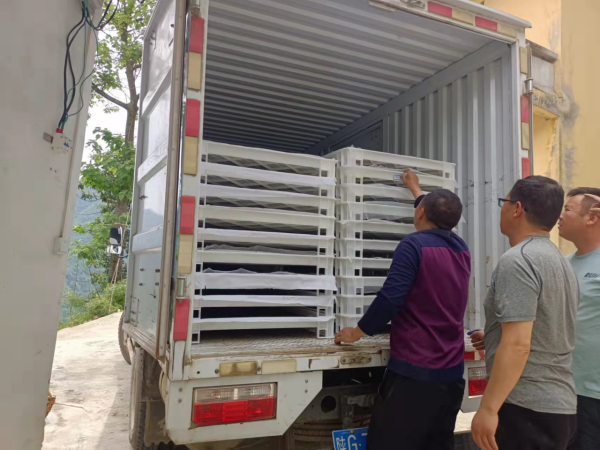 在小蠶共育基地外,一輛輛裝著蠶箔的車輛依次來到小蠶共育基地領(lǐng)取小蠶。蠶農(nóng)們井然有序和基地技術(shù)員開展著清點(diǎn)、登記、裝車等工作。