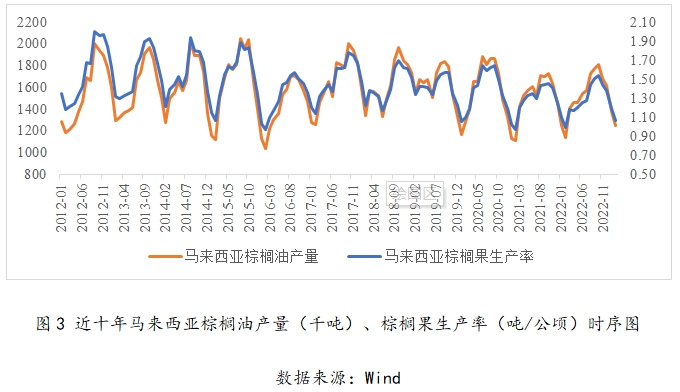棕櫚樹是一種多年生喜雨作物,一般要求年降雨量維持在1300-2000mm以上。當(dāng)月降雨量為200-350mm時(shí),棕櫚油月度產(chǎn)量相對(duì)較高。下圖為近十年馬來西亞棕櫚油產(chǎn)量(千噸)、棕櫚果生產(chǎn)率(噸/公頃)時(shí)序圖,二者表現(xiàn)出明顯的周期性。按照季節(jié)性生產(chǎn)規(guī)律,棕櫚油產(chǎn)量從3月份開始產(chǎn)量持續(xù)回升,直至10月達(dá)到全年峰值,到次年2月,產(chǎn)量逐月減少。主要由于4月至10月份是東南亞地區(qū)傳統(tǒng)的雨季,充沛的降雨利于棕櫚油的生長(zhǎng),而10月份之后,降雨普遍減少,棕櫚果單產(chǎn)和棕櫚油產(chǎn)量均下滑。