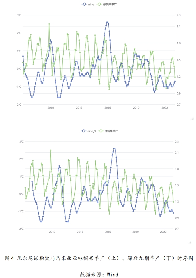滯后性的原因在于棕櫚油開花結(jié)果壓榨的長(zhǎng)周期。棕櫚果成熟前5-15個(gè)月是棕櫚樹的花絮發(fā)芽和授粉階段,此時(shí)降雨量的多寡將影響雌雄花發(fā)育比例,過少的降雨將形成更多雄花,造成單產(chǎn)下滑。從2007年到2022年的馬來西亞棕櫚果單產(chǎn)數(shù)據(jù)來看,厄爾尼諾指數(shù)與9個(gè)月之后的棕櫚果單產(chǎn)走勢(shì)相似。