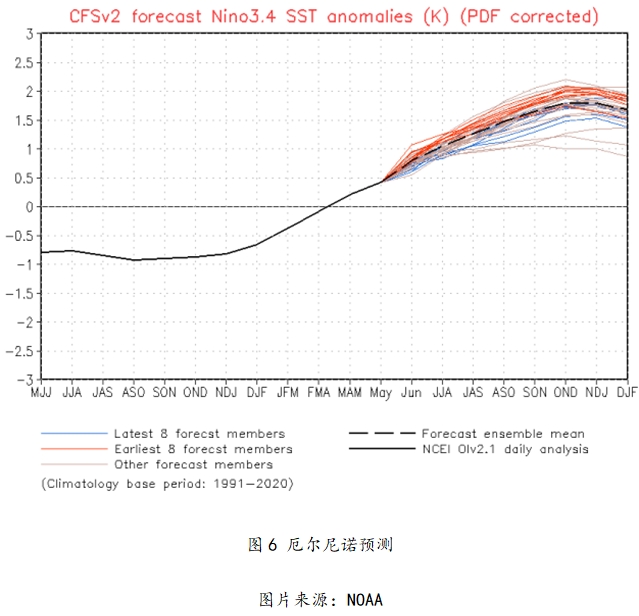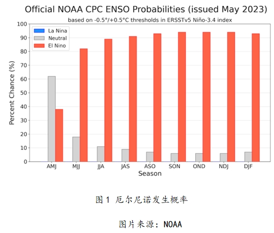 圖1為NOAA(美國(guó)海洋大氣管理局)預(yù)測(cè)的未來厄爾尼諾現(xiàn)象的發(fā)生概率。預(yù)計(jì)中性水平將持續(xù)到5月,7月以后有超過90%的可能性出現(xiàn)厄爾尼諾現(xiàn)象。
