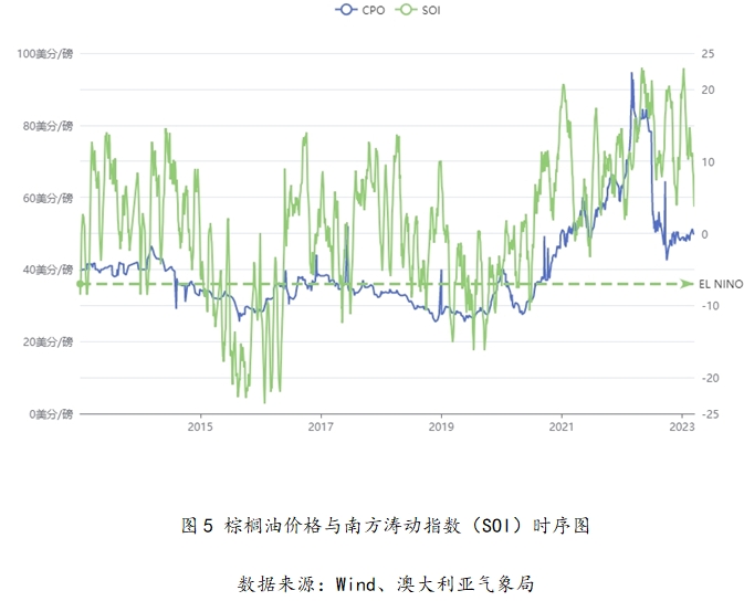 棕櫚油價(jià)格傾向于在厄爾尼諾峰值附近筑底,拉尼娜峰值附近筑頂,與南方濤動(dòng)指數(shù)(SOI)走勢(shì)相近。
