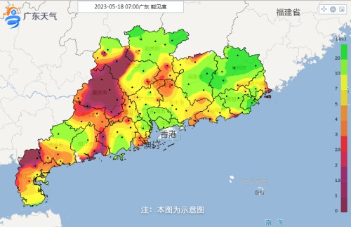 受切變線東移南壓影響,18日-19日,粵北、珠江三角洲和粵東市縣有中(雷)雨,局部大雨或暴雨,雷雨時局地伴有7-8級短時大風(fēng);20-21日,廣東大部多云,部分市縣有(雷)陣雨。另外,19-20日早晨,部分市縣有輕霧或霧。近期多雷雨天氣,注意防御雷電和局地短時強降水引發(fā)的災(zāi)害;早晨霧時能見度差,注意交通安全。