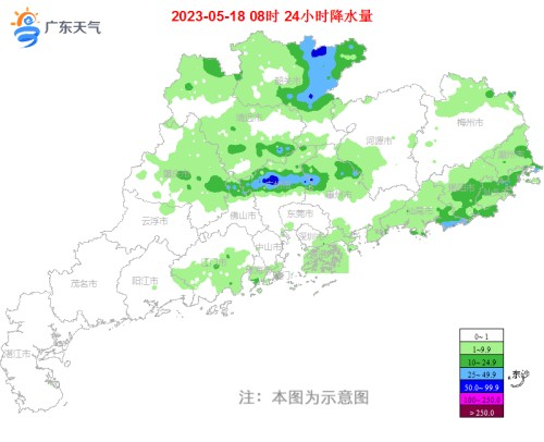 天氣實況:17日白天到18日早晨,粵北、珠江三角洲北部和南部、粵東市縣出現(xiàn)了(雷)陣雨局部大雨或暴雨。據(jù)監(jiān)測,全省有20個鎮(zhèn)街錄得超過50毫米的暴雨,有78個鎮(zhèn)街錄得25毫米~50毫米的大雨,各市雨量最大的鎮(zhèn)街有:廣州從化區(qū)太平鎮(zhèn)90.2毫米、韶關(guān)始興縣隘子鎮(zhèn)85毫米、惠州龍門縣麻榨鎮(zhèn)62.3毫米。