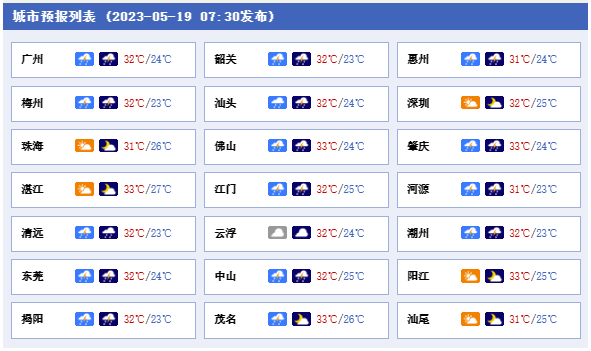 19日,珠江三角洲、粵東和粵北市縣多云間陰天,有中(雷)雨,局部大雨或暴雨,其余市縣多云,有分散(雷)陣雨。最高氣溫:粵西和珠江三角洲西部市縣32℃~34℃,其余市縣29℃~32℃。