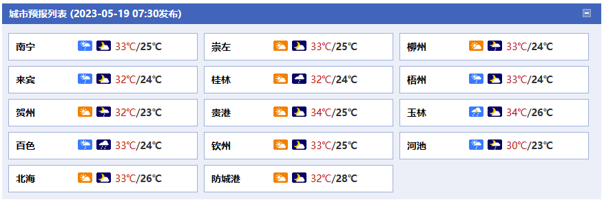 今天(19日)全區(qū)以多云到陰天為主,大部地區(qū)有陣雨或雷雨出沒,請注意防范。上午8時,我區(qū)大部氣溫在22~27℃,在弱冷空氣的影響下,預(yù)計今天廣西各地最高氣溫不超過35℃,燥熱天氣有所緩和。