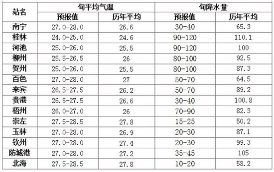 全區(qū)旬平均氣溫、旬降雨量預(yù)報(bào)如下:
