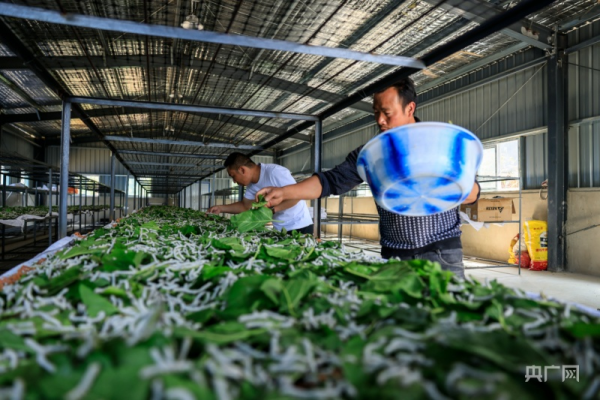不遠(yuǎn)處的小蠶共育廠房?jī)?nèi),謝曉露帶著“副手”謝軍正穿梭在一排排整齊的蠶架間,細(xì)心地整理蠶床,給小蠶喂食桑葉。