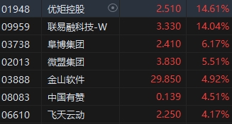 軟件類股全線上漲,金山云(2.64, 0.38, 16.81%)大漲逾16%,優(yōu)矩控股(2.51, 0.32, 14.61%)、聯(lián)易融科技漲超14%,消息面上,昨日工信部數(shù)據(jù)顯示,1至4月份,中國規(guī)模以上互聯(lián)網(wǎng)和相關(guān)服務(wù)企業(yè)完成互聯(lián)網(wǎng)業(yè)務(wù)收入4083億元,同比增長3.3%;實(shí)現(xiàn)利潤總額384億元,同比增長62.1%。
