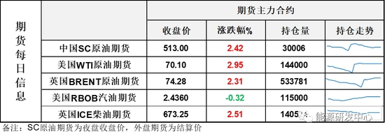 【1】WTI主力原油期貨收漲2.01美元,漲幅2.95%,報70.1美元/桶;布倫特主力原油期貨收漲1.68美元,漲幅2.31%,報74.28美元/桶;INE原油期貨收漲2.42%,報513元。