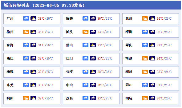 明后兩天,粵西、珠三角南部市縣有中雷雨局部大暴雨,其余市縣有雷陣雨,局部有大雨或暴雨。最高氣溫:粵西和沿海市縣31℃~33℃,其余大部分市縣34℃~36℃、部分市縣37℃左右。