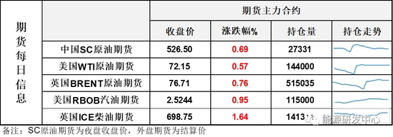 【1】WTI主力原油期貨收漲0.41美元,漲幅0.57%,報(bào)72.15美元/桶;布倫特主力原油期貨收漲0.58美元,漲幅0.76%,報(bào)76.71美元/桶;INE原油期貨收漲0.69%,報(bào)526.5元。