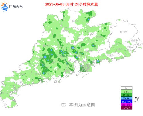 6日-7日,粵西和珠江三角洲市縣有中到強(qiáng)雷雨局部暴雨或大暴雨,其余市縣有雷陣雨局部大雨或暴雨。最高氣溫:粵西和沿海市縣30℃~32℃,其余大部分市縣33℃~35℃。