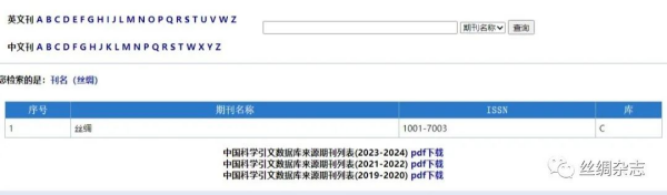 近日,中國(guó)科學(xué)院文獻(xiàn)情報(bào)中心正式發(fā)布2023-2024年度中國(guó)科學(xué)引文數(shù)據(jù)庫(kù)來(lái)源期刊目錄,經(jīng)過(guò)定量遴選、專家定性評(píng)估,《絲綢》成功入選核心庫(kù),為紡織領(lǐng)域僅入選的兩本期刊之一。