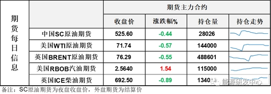 【1】WTI主力原油期貨收跌0美元,跌幅0.57%,報71.74美元/桶;布倫特主力原油期貨收跌0.42美元,跌幅0.55%,報76.29美元/桶;INE原油期貨收跌0.44%,報525.6元。