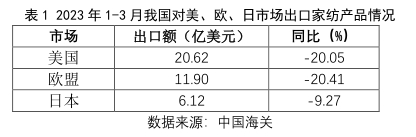 傳統(tǒng)市場(chǎng)下降明顯。一季度我國(guó)對(duì)美歐日傳統(tǒng)市場(chǎng)出口家用紡織品38.63億美元,同比下降18.64%,其中對(duì)美國(guó)出口下降20.05%,對(duì)歐盟出口下降20.41%,對(duì)日本出口下降6.56%。