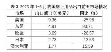 從產(chǎn)品品類看,床上用品和布藝產(chǎn)品下降明顯。美國(guó)作為我國(guó)床上用品出口第一大市場(chǎng),體量占比有明顯收窄,1-3月對(duì)其出口床上用品9.36億美元,同比大幅下降25.96%。