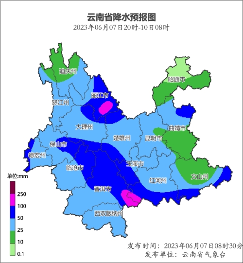 6月8日:昆明市西部、楚雄州、玉溪市、紅河州、文山州西部和南部、麗江市、大理州、普洱市東部陰有中到大雨局部暴雨。