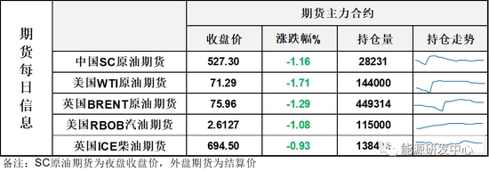 【1】WTI主力原油期貨收跌1.24美元,跌幅1.71%,報(bào)71.29美元/桶;布倫特主力原油期貨收跌0.99美元,跌幅1.29%,報(bào)75.96美元/桶;INE原油期貨收跌1.16%,報(bào)527.3元。