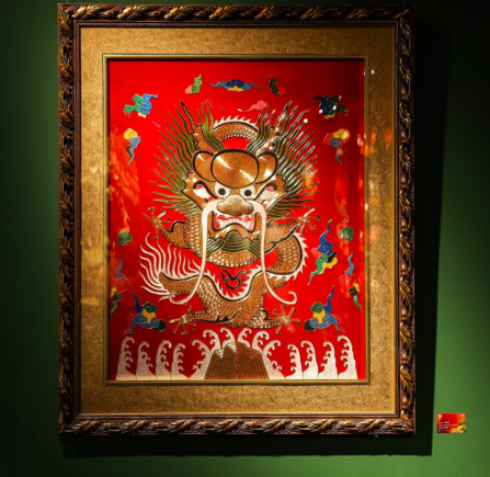 浙江展團(tuán)內(nèi),在金華婺繡展區(qū),婺劇戲服制作技藝傳承人吳方希蔓展示的作品《八婺龍屏》很是吸睛,它采用傳統(tǒng)婺劇戲服蟒袍上的坐龍圖案。這是婺劇400年傳承的八婺龍圖。