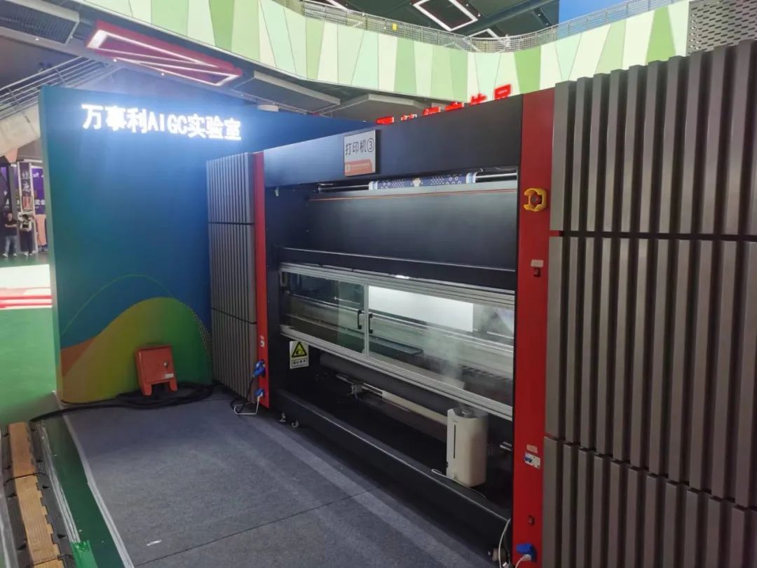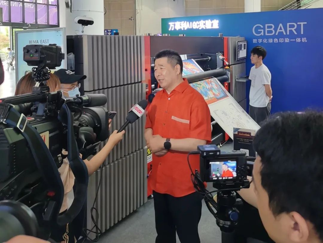 在絲綢宣傳展場館的右側(cè),杭州萬事利公司展出的GBART數(shù)字化綠色印染一體機(jī)特別引人注目。它耗時8年研發(fā)而成,具備無污染、體積小、生產(chǎn)速度快等優(yōu)勢,融合數(shù)字化色彩管理技術(shù),使墨水與纖維精準(zhǔn)結(jié)合,實(shí)現(xiàn)絲、棉、毛、麻、再生纖維素纖維等面料在印染過程中節(jié)水99%以上,從而達(dá)到無污水排放。它可實(shí)現(xiàn)小批量快交付,破解行業(yè)庫存積壓痛點(diǎn),幫助紡織企業(yè)開創(chuàng)先銷售再生產(chǎn)經(jīng)營新模式。李建華董事長正在接受采訪。