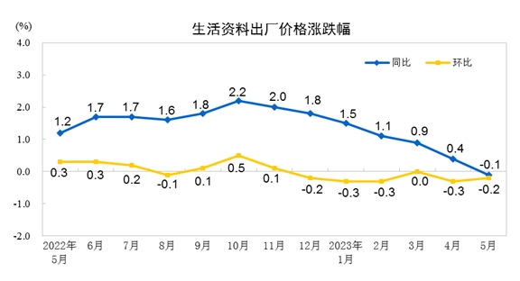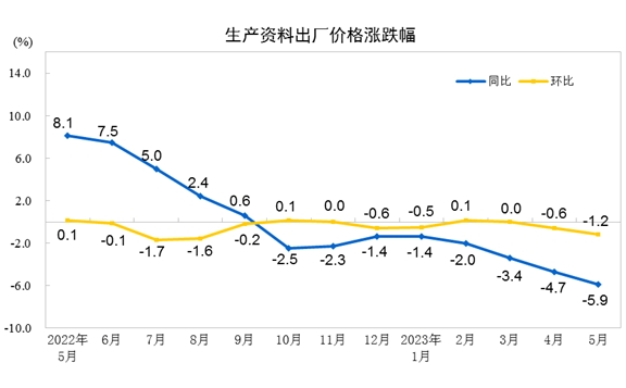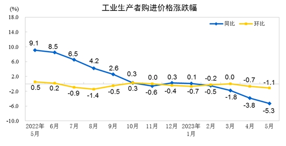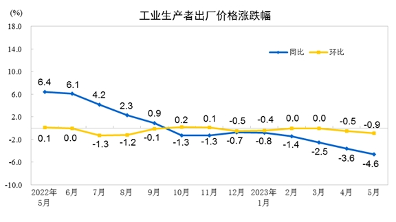 2023年5月份,全國(guó)工業(yè)生產(chǎn)者出廠價(jià)格同比下降4.6%,環(huán)比下降0.9%;工業(yè)生產(chǎn)者購(gòu)進(jìn)價(jià)格同比下降5.3%,環(huán)比下降1.1%。1—5月平均,工業(yè)生產(chǎn)者出廠價(jià)格比去年同期下降2.6%,工業(yè)生產(chǎn)者購(gòu)進(jìn)價(jià)格下降2.3%。