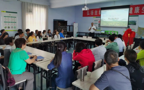 講座中,魯寶公司桑園公社負(fù)責(zé)人安豐剛介紹了桑園基地的發(fā)展歷史,講解了公司探索新發(fā)展模式,打造桑園公社品牌培育示范基地等一系列行動(dòng)并實(shí)物教學(xué)了蠶的飼養(yǎng)、蠶絲被的制作、手工及工業(yè)繅絲等桑蠶特色產(chǎn)品生產(chǎn)加工過(guò)程。通過(guò)多種形式教學(xué),大家深入感悟春蠶精神、絲路精神、勞動(dòng)精神,為把傳統(tǒng)的桑蠶文化在新時(shí)代閃耀光芒而積極工作。