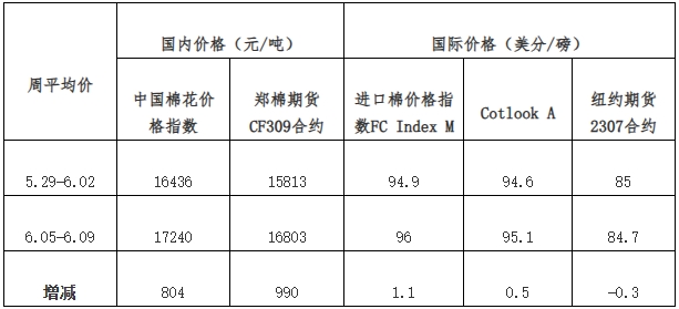 上周中國(guó)棉花價(jià)格指數(shù)(CCIndex 3128B)周均價(jià)為17240元/噸,環(huán)比上漲804元;Cotlook A指數(shù)周均價(jià)95.1美分/磅,環(huán)比上漲0.5美分,1%關(guān)稅下折人民幣16290元/噸(含200元/噸港口費(fèi)用),比中國(guó)棉花價(jià)格指數(shù)(CCIndex 3128B)低949元,價(jià)差較前一周擴(kuò)大607元;鄭州期貨主力合約CF309周均價(jià)16803元/噸,環(huán)比上漲990元;ICE棉花期貨近期合約周均價(jià)84.7美分/磅,環(huán)比下跌0.3美分。