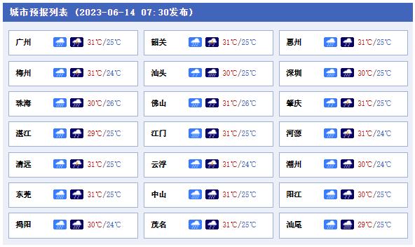 悶熱不下線!今天(6月14日)廣東大部地區(qū)最高氣溫將超30℃,河源、梅州和粵東市縣最高氣溫可達(dá)32℃~34℃。同時(shí),“龍舟水”也持續(xù)發(fā)力,珠江三角洲和粵北南部等地部分地區(qū)有大到暴雨。