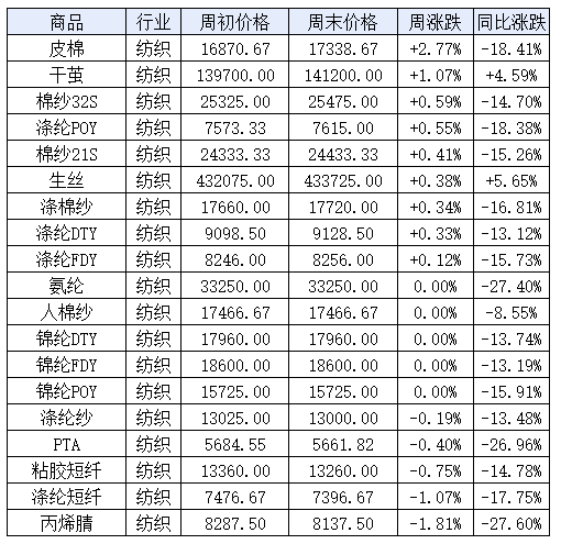 2023年第23周(6.5-6.9)紡織大宗商品價(jià)格漲跌榜