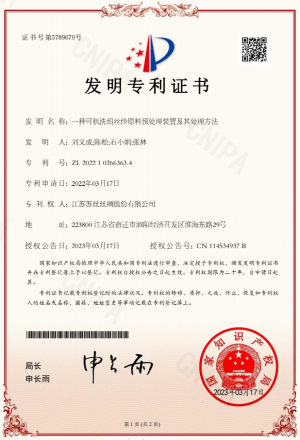 為解決絲綢行業(yè)這個(gè)老大難問(wèn)題,江蘇蘇絲絲綢股份有限公司歷時(shí)五年潛心研究,與日本企業(yè)合作研發(fā)工藝,改造創(chuàng)新設(shè)備,取得了重大進(jìn)展。2023年3月17日蘇絲股份獨(dú)家申請(qǐng)的“一種可機(jī)洗絹絲紗原料預(yù)處理裝置及其處理方法”獲得發(fā)明專(zhuān)利授權(quán)。