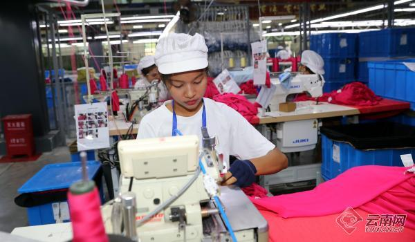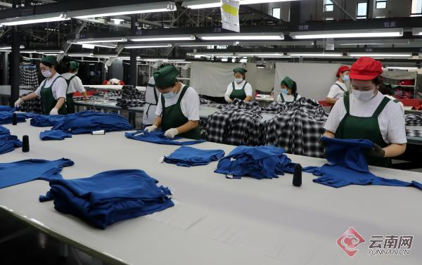 圖為云南凱喜雅絲綢紡織工業(yè)園區(qū)內(nèi),工人們正在有條不紊地生產(chǎn)服飾