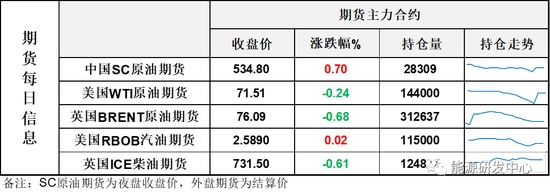【1】WTI原油期貨因假日提前收盤(pán),收跌0.17美元,跌幅0.24%,報(bào)收71.51美元/桶;布倫特主力原油期貨收跌0.52美元,跌幅0.68%,報(bào)76.09美元/桶;INE原油期貨收漲0.7%,報(bào)534.8元。