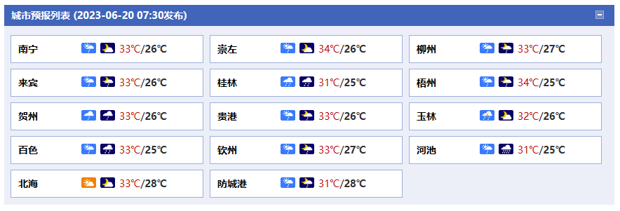南寧市:今天白天,多云有陣雨,偏南風(fēng)2~3級,最低氣溫26℃,最高氣溫33℃。