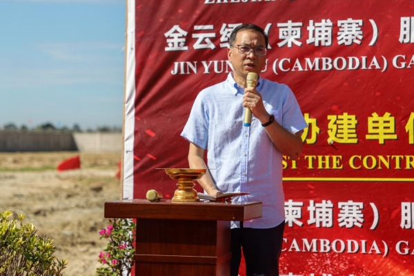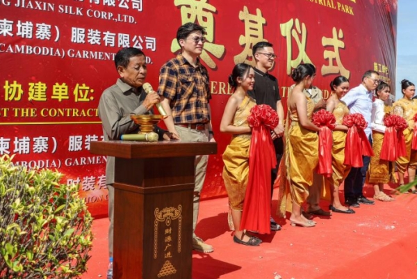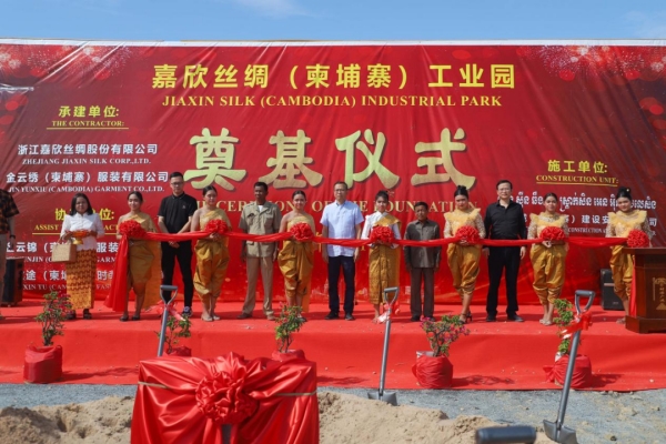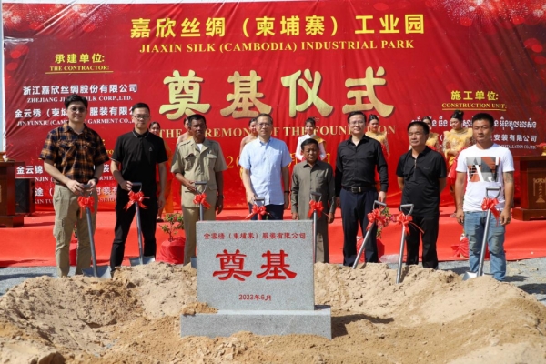 6月19日柬埔寨時間上午8時38分,嘉欣絲綢(柬埔寨)工業(yè)園暨金云繡(柬埔寨)服裝有限公司奠基儀式隆重舉行。