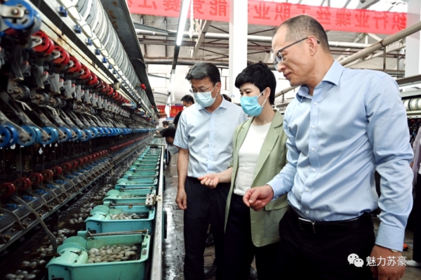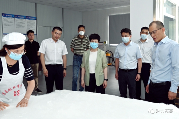 楊厚宏向陳智泉一行介紹了企業(yè)繭絲綢相關(guān)產(chǎn)業(yè)鏈,并對(duì)蠶絲被等主營(yíng)產(chǎn)品制作流程和質(zhì)量進(jìn)行詳細(xì)介紹。雙方就目前企業(yè)的生產(chǎn)經(jīng)營(yíng)狀況,產(chǎn)品銷(xiāo)售渠道等方面的相關(guān)問(wèn)題展開(kāi)交流。陳智泉對(duì)蘇豪牌白廠絲和蠶絲被等產(chǎn)品質(zhì)量表示高度贊賞,雙方要進(jìn)一步立足企業(yè)優(yōu)勢(shì)推動(dòng)共同發(fā)展。