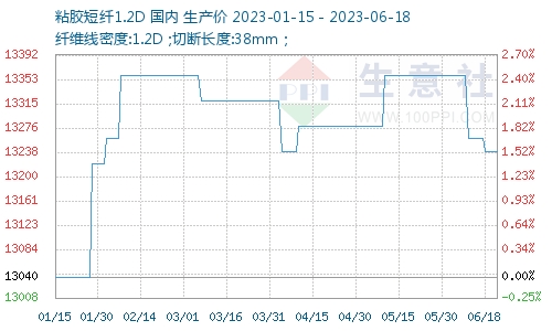 據(jù)生意社商品行情分析系統(tǒng)顯示,上周(2023年6月12—18日),粘膠短纖價格重心微微下調(diào),截止6月18日,1.2D*38mm粘膠短纖國內(nèi)地區(qū)出廠報價為13240元/噸,較上周期價格下跌20元/噸。