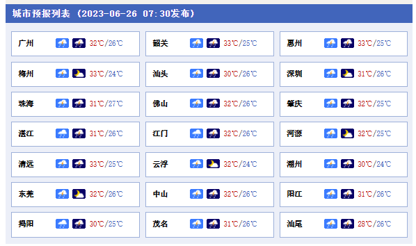 城市方面,廣州今天白天多云,有雷陣雨;夜間多云間晴,局部有雷陣雨;氣溫介于27℃~33℃之間,相對(duì)濕度介于75%~95%之間,吹輕微的東南風(fēng)。