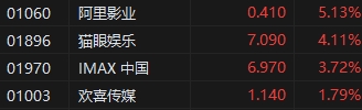電影概念股逆勢上漲,阿里影業(yè)(0.41, 0.02, 5.13%)漲超5%,貓眼娛樂(7.09, 0.28, 4.11%)漲超4%,IMAX中國漲超3%,消息面上,據(jù)國家電影局初步統(tǒng)計,2023年端午檔(6月22日至6月24日)電影票房為9.09億元,取得了影史端午檔票房第二的成績,觀影人次為2249萬,國產(chǎn)影片票房占比為80.08%。