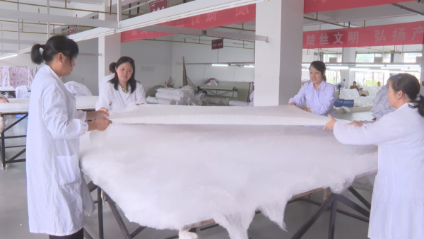 走進(jìn)湖北楚凰絲綢產(chǎn)業(yè)有限公司生產(chǎn)車間,工人師傅們正站在操作臺(tái)旁,合力扯開手中的綿兜,原本緊實(shí)的綿兜變成了輕柔的綿片,再將綿片扯成一層層絲綿疊鋪在被單上,潔白蓬松的蠶絲被逐漸成型。