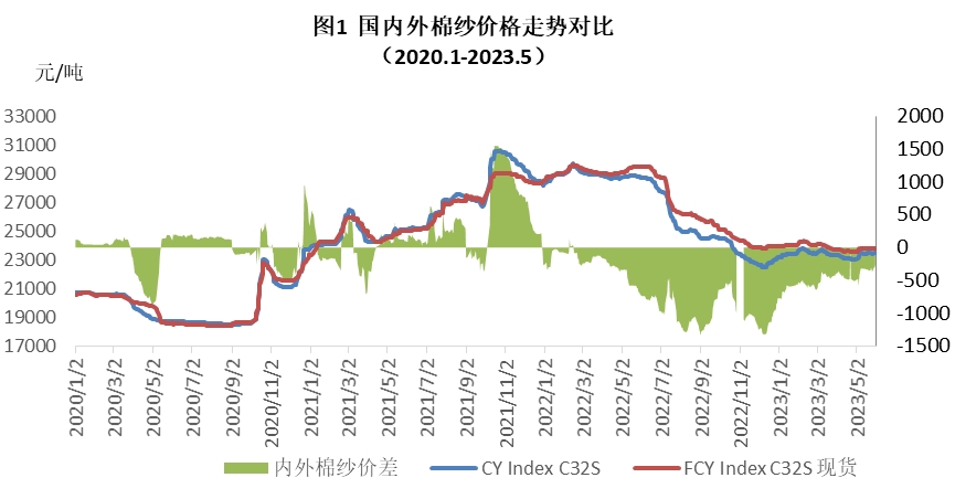 本月內(nèi)外棉紗價(jià)格略有上漲,國(guó)產(chǎn)32支純棉紗5月均價(jià)23419元/噸,較上月上漲283元,漲幅1.22%,較去年同期下跌5393元,跌幅18.7%;進(jìn)口32支純棉紗5月均價(jià)23770元/噸,較上月上漲172元,漲幅0.73%,較去年同期下跌5566元,跌幅19%。
