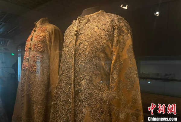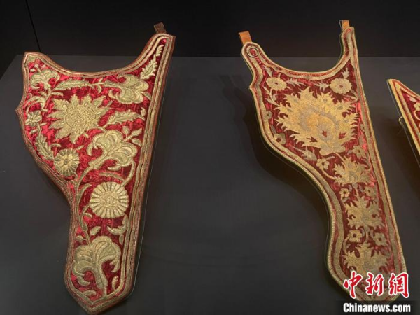 圖為現(xiàn)場(chǎng)展出的儀式用弓袋,上有銀鍍金絲刺繡,圖案精美