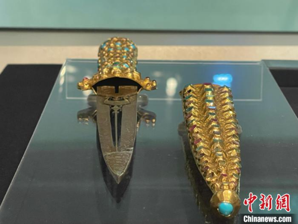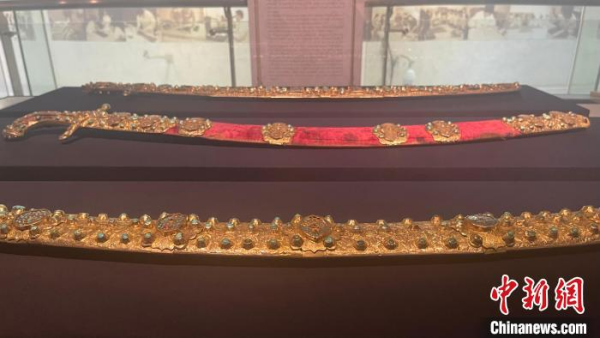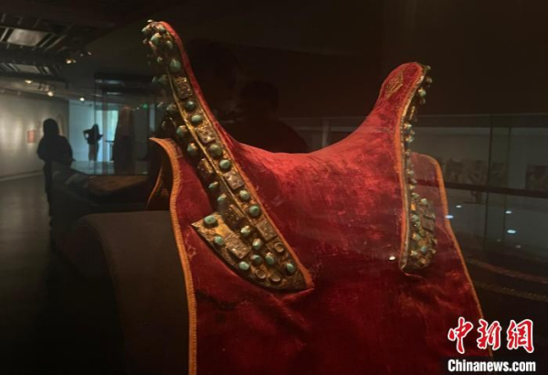 圖為現(xiàn)場(chǎng)展出的儀式用馬鞍,上面有寶石