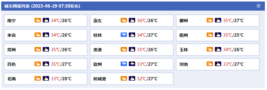 南寧市:今天白天多云,午后局地有陣雨,偏南風1~2級,最低氣溫26℃,最高氣溫34℃。