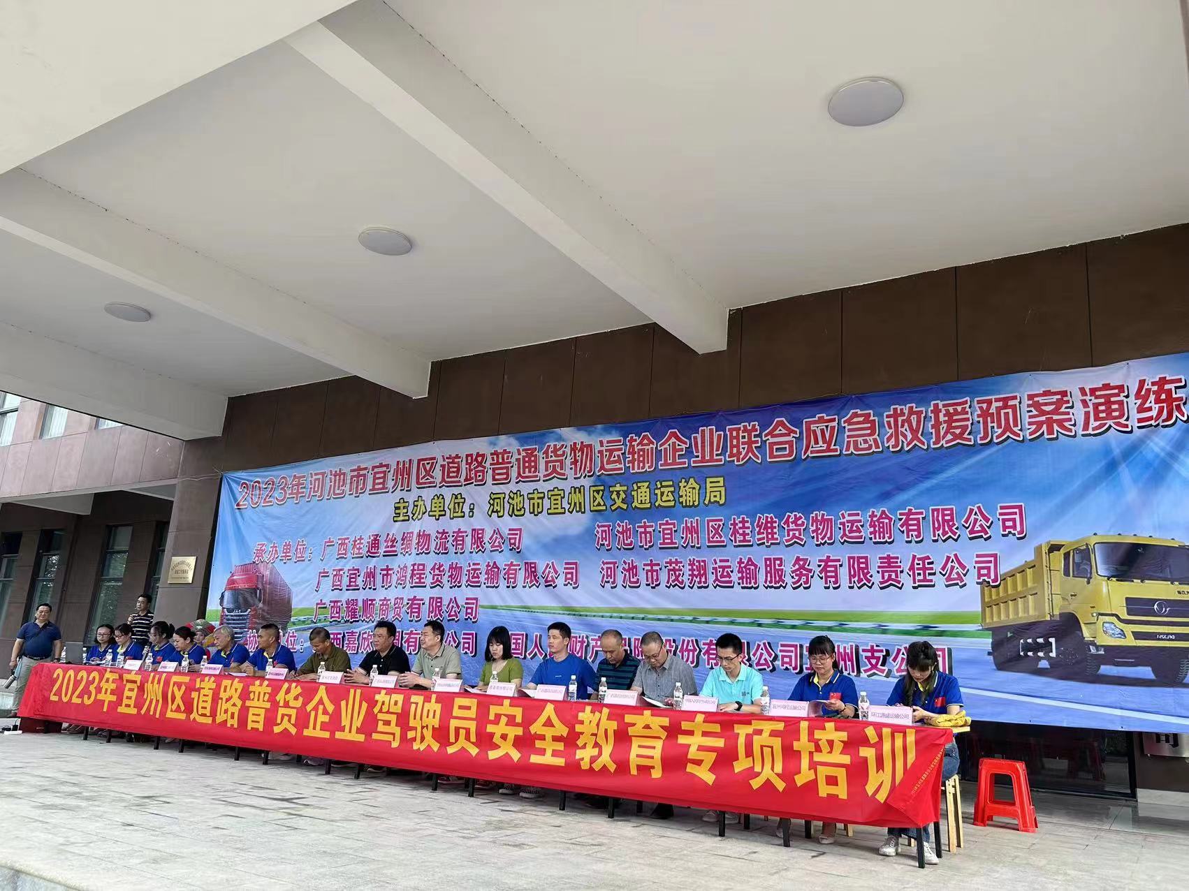 2023年6月是第22個(gè)“安全生產(chǎn)月”,為貫徹落實(shí)相關(guān)工作部署,進(jìn)一步檢驗(yàn)和完善《應(yīng)急救援預(yù)案》的實(shí)用性和有效性,由廣西河池市宜州區(qū)交通運(yùn)輸局主辦、廣西桂通絲綢物流有限公司等五家公司承辦、廣西嘉欣絲綢有限公司和中國(guó)人保宜州分公司共同協(xié)辦的宜州區(qū)道路普通貨物運(yùn)輸企業(yè)聯(lián)合應(yīng)急救援預(yù)案演練活動(dòng)于今日(2023年6月30日)在廣西嘉欣絲綢園內(nèi)舉行并圓滿完成。本次活動(dòng)還特別邀請(qǐng)了廣西恒業(yè)、廣西嘉聯(lián)、宜州宏基等多家繭絲綢企業(yè)共同參與。