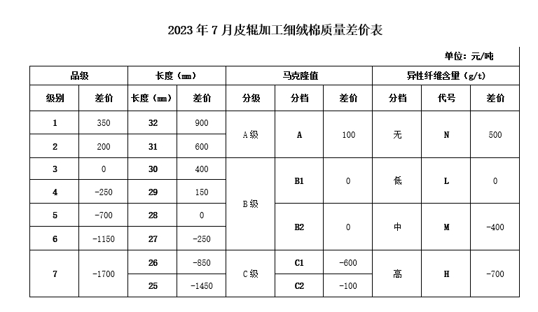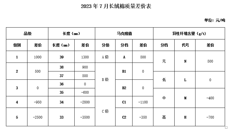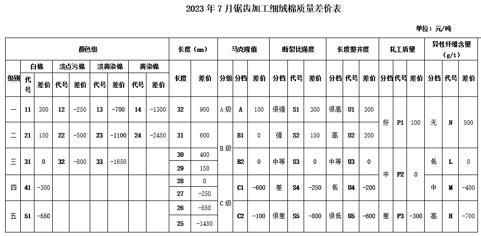 2023年7月中棉協《國產棉質量差價表》發(fā)布