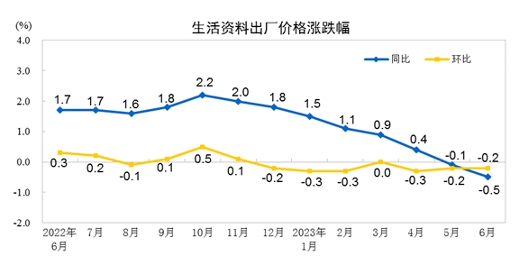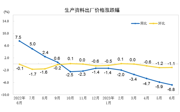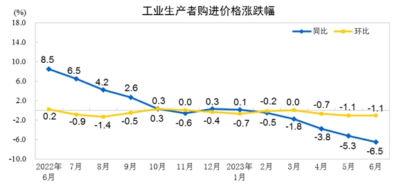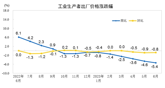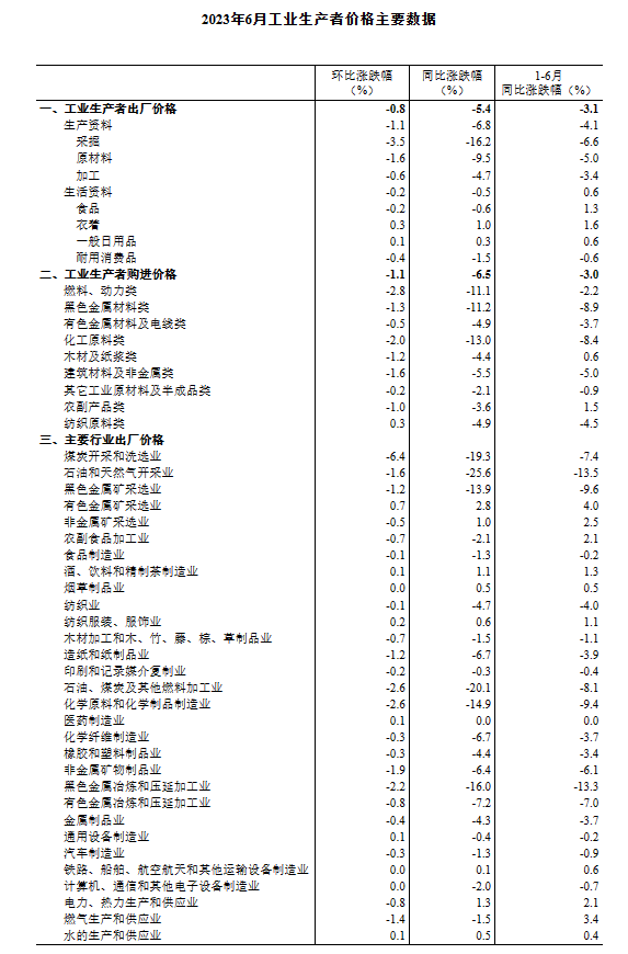 2023年6月份,全國工業(yè)生產(chǎn)者出廠價格同比下降5.4%,環(huán)比下降0.8%;工業(yè)生產(chǎn)者購進價格同比下降6.5%,環(huán)比下降1.1%。上半年,工業(yè)生產(chǎn)者出廠價格比上年同期下降3.1%,工業(yè)生產(chǎn)者購進價格下降3.0%。