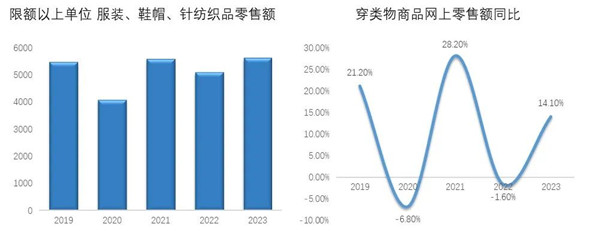 2019-2023年1~5月限額以上單位服裝零售額變化與穿類商品網(wǎng)上零售額同比變化情況