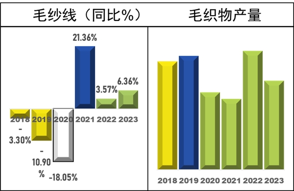 2018-2023年前5個月毛紗線產(chǎn)量同比變化與毛織物產(chǎn)量變化情況